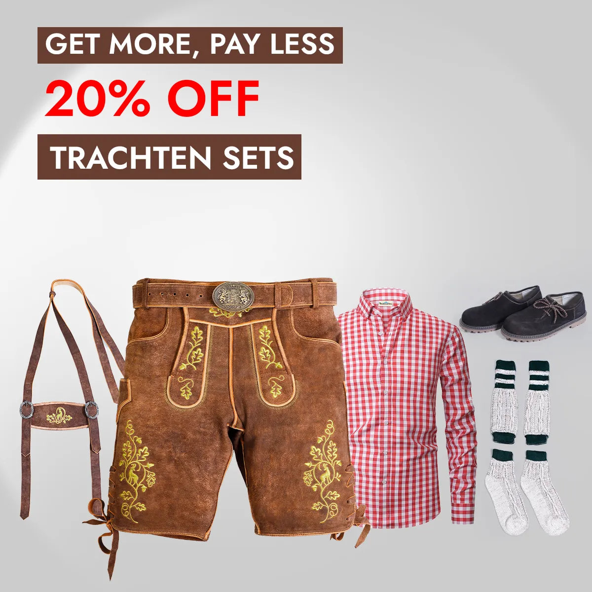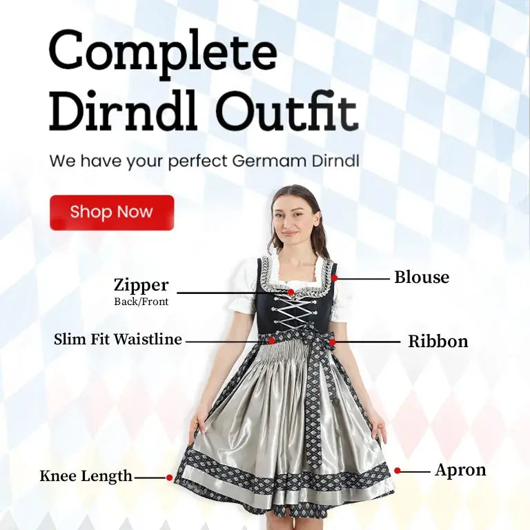 Complete your German outfit with authentic accessories and add the perfect finishing touch, ensuring you stand out at any event. From trachten waistcoats and checkered shirts to loferl socks and haferl shoes, our store has everything you need to complete your Oktoberfest look. For women, our dirndl comes with aprons and blouses, available in all sizes and lengths to suit your sense of style.